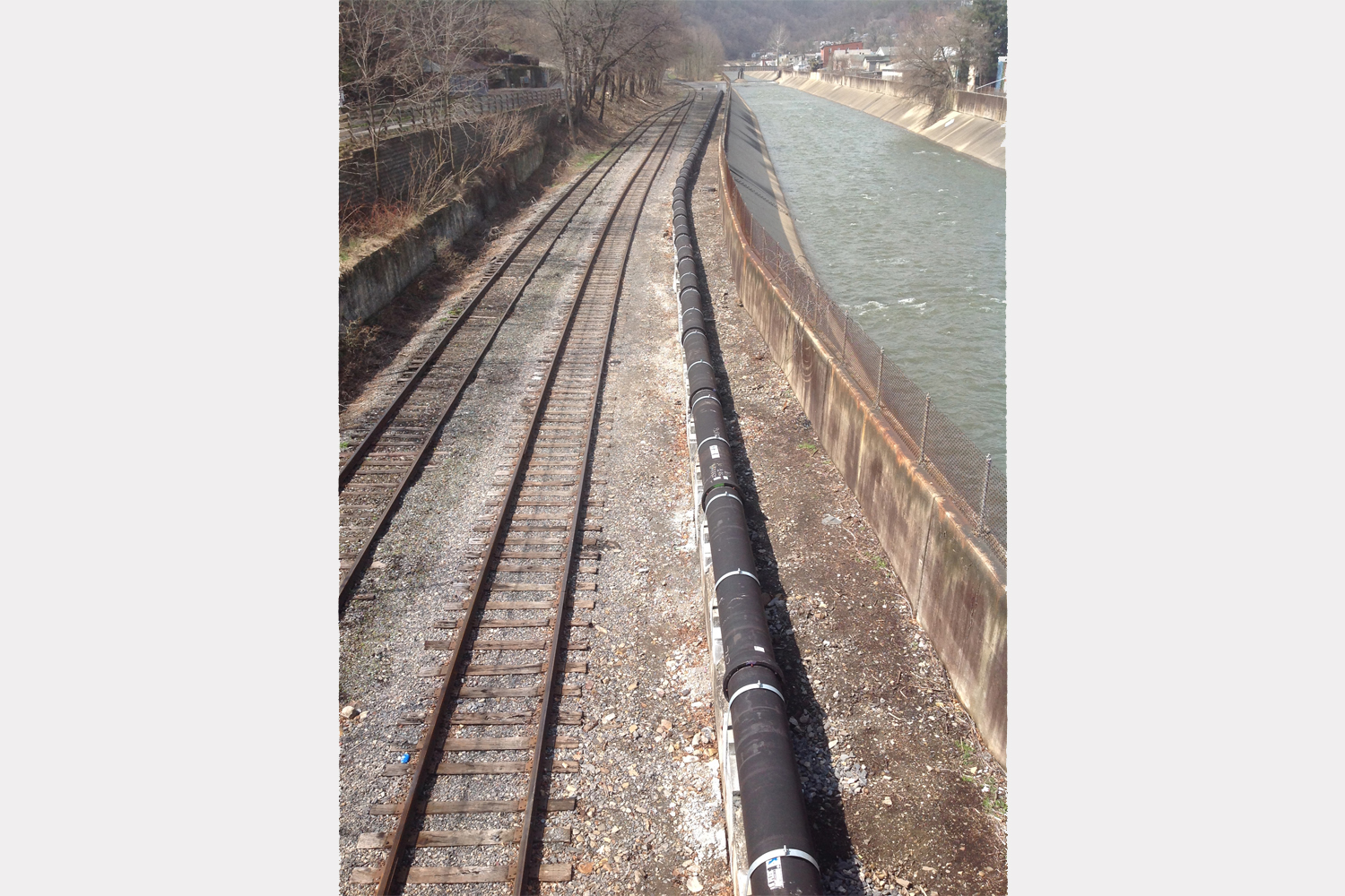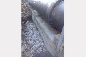 The LaVale Sanitary Commission engaged The EADS Group, Inc. to perform engineering services for the replacement of the above ground portion of their 24” diameter force main. The existing force main conveyed wastewater from the LaVale area, City of Frostburg and portions of Allegeny County, MD. The existing force main was constructed of PCCP and both the exterior concrete layer and reinforcing wire had failed in areas. The design process included detailed coordination due to the existing force main location between an active railroad and a floodwall. The design included bypassing arrangements using hot taps and line stops to provide continuous service during construction. The existing force main was replaced with 24” ductile iron restrained joint pipe with expansion joints. Extensive concrete repairs to areas of the support wall were also included in the project.